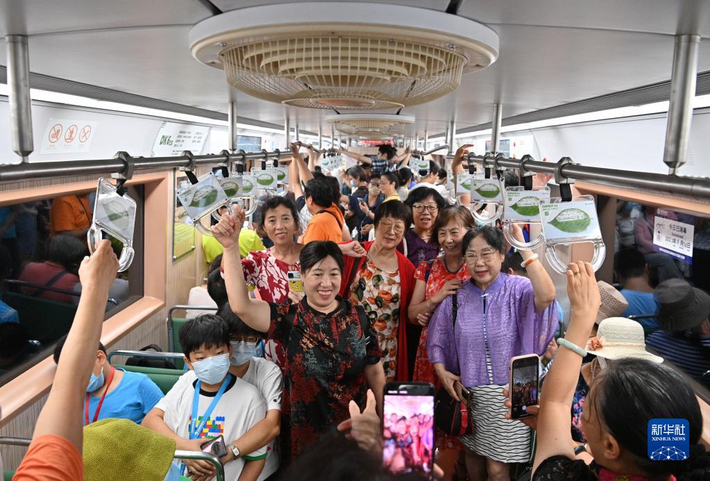 8月14日,乘客在北京地鐵一號線(xiàn)“時(shí)光列車(chē)”上拍照留念。