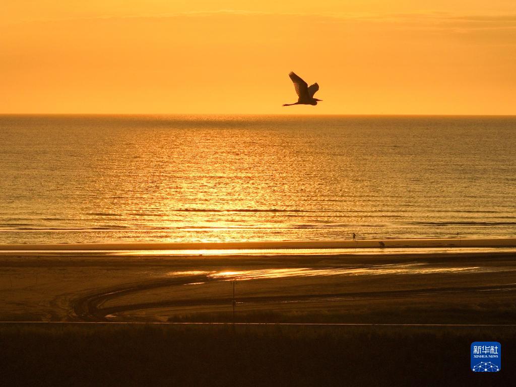 江蘇省啟東市黃金海灘景區日出景色(2023年7月25日攝,無(wú)人機照片)。