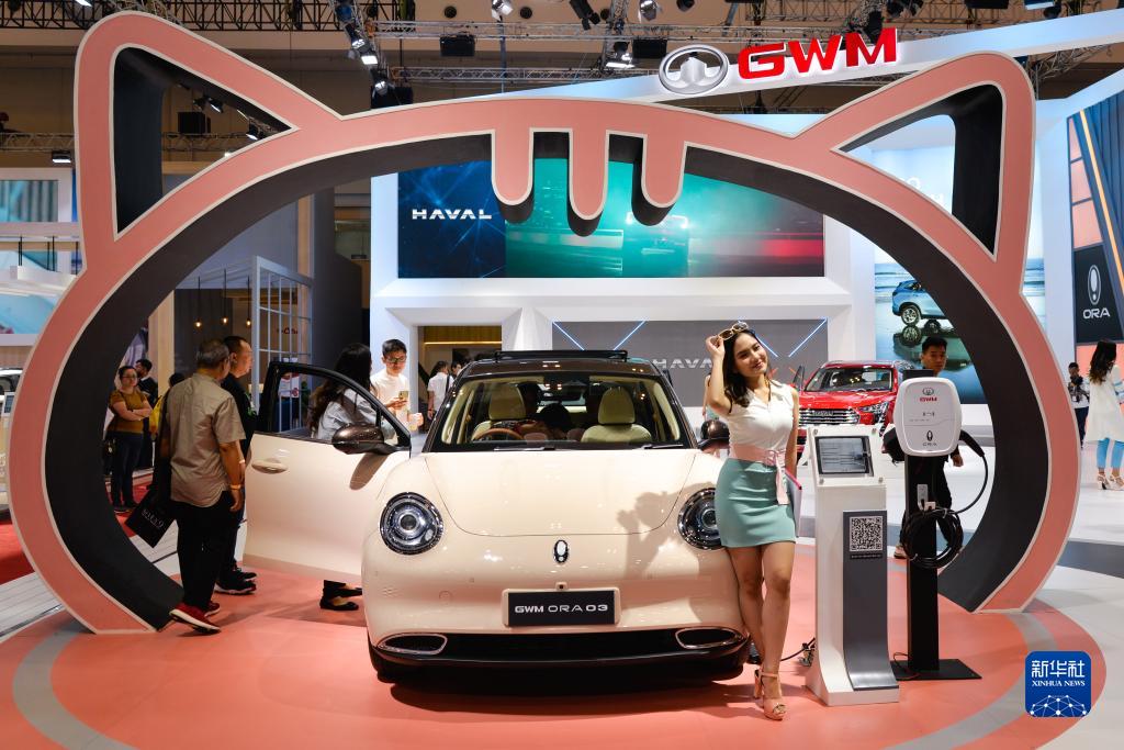 8月14日,在印度尼西亞萬(wàn)丹省唐格朗的印尼會(huì )展中心,一名車(chē)模在2023年印尼國際汽車(chē)展上的中國汽車(chē)品牌長(cháng)城汽車(chē)展臺展示汽車(chē)。