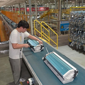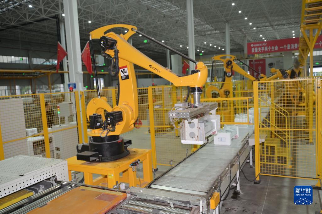 8月14日,在格力電器(贛州)有限公司,機器人在自動(dòng)打包空調。