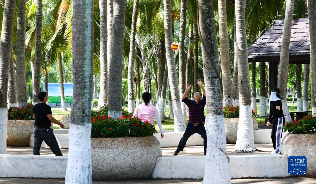 市民在??谑腥f(wàn)綠園內打排球(2022年4月5日攝)。