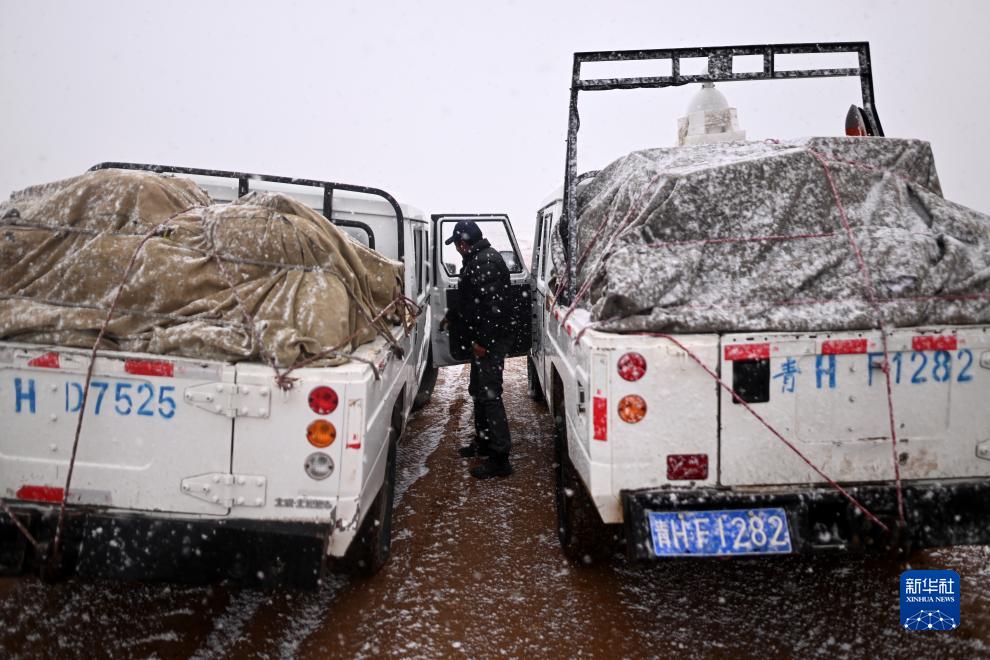 可可西里管理處卓乃湖保護站隊員在前往卓乃湖保護站途中遭遇大雪(6月16日攝)。