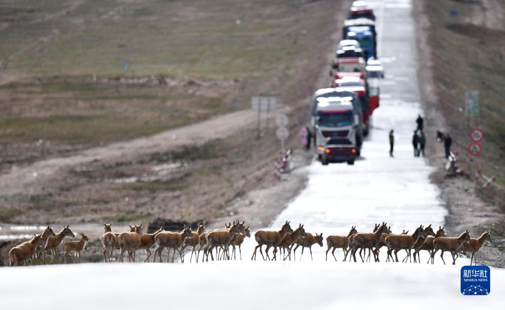 一群藏羚羊通過(guò)青藏公路前往青海三江源地區(7月28日攝)。