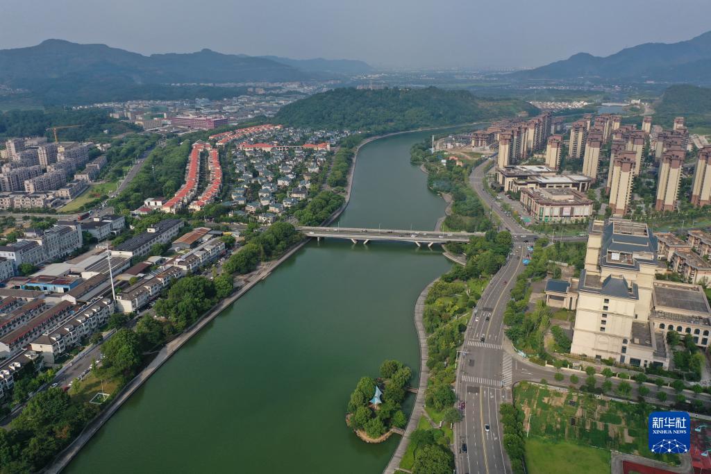 鳥(niǎo)瞰流經(jīng)寧波市奉化區溪口鎮的剡江(8月11日無(wú)人機照片)。