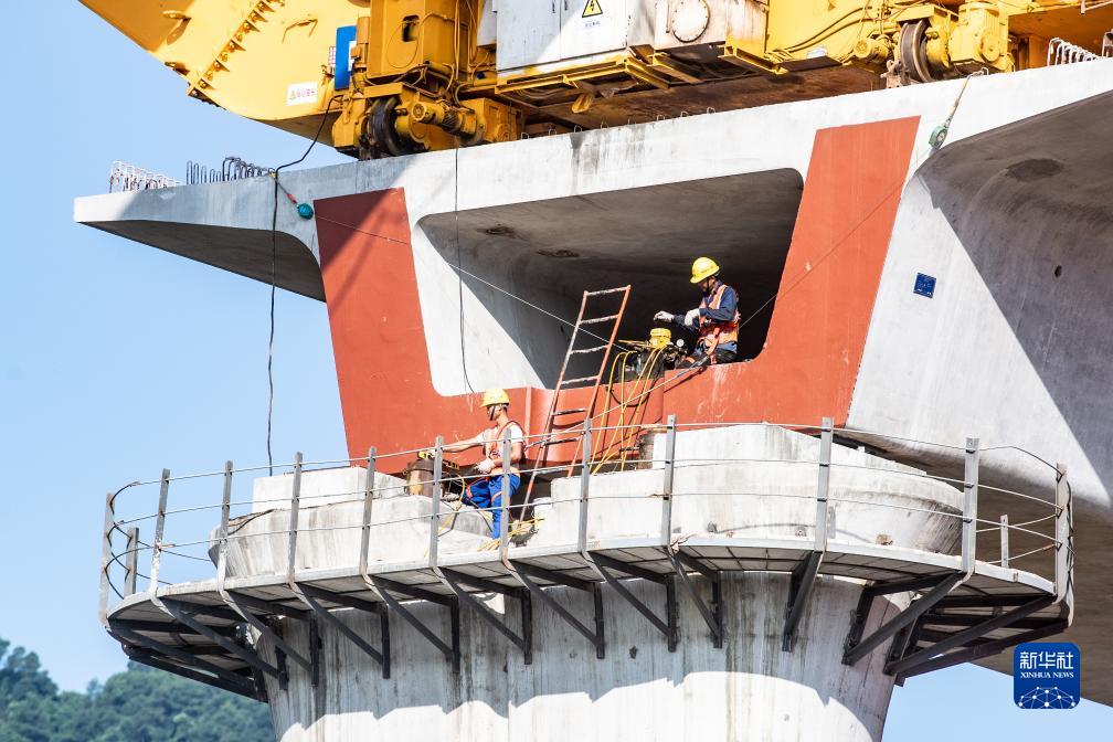 8月15日,在渝湘高鐵重慶段建設現場(chǎng),施工人員在架橋機的幫助下進(jìn)行首榀箱梁架設作業(yè)。