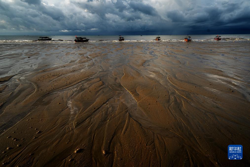 清晨,迅速變化的光線(xiàn)和云彩、來(lái)來(lái)往往的游客、聞雞起舞的漁人以及奔騰不息的波浪,在廣西東興的金灘上一起奏響了一首美妙的樂(lè )曲。