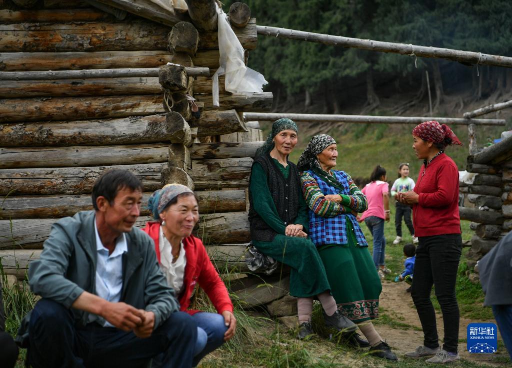 在新疆昌吉市廟爾溝鄉索爾巴斯陶牧場(chǎng)上,參與聚會(huì )的牧民在一起聊天休息(8月12日攝)。