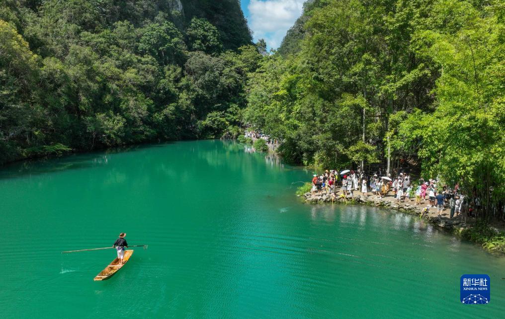 8月15日,游客在貴州省荔波小七孔風(fēng)景區游玩(無(wú)人機照片)。