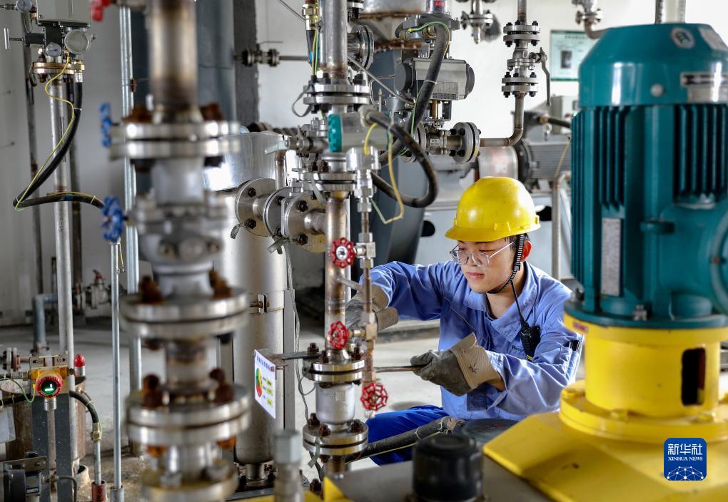 8月15日,河北衡水高新技術(shù)產(chǎn)業(yè)開(kāi)發(fā)區一家新材料生產(chǎn)企業(yè)的工人在生產(chǎn)車(chē)間內維護生產(chǎn)設備。
