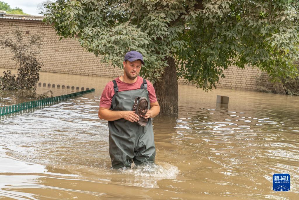 8月15日,在俄羅斯烏蘇里斯克市,一名男子在洪水中行走。