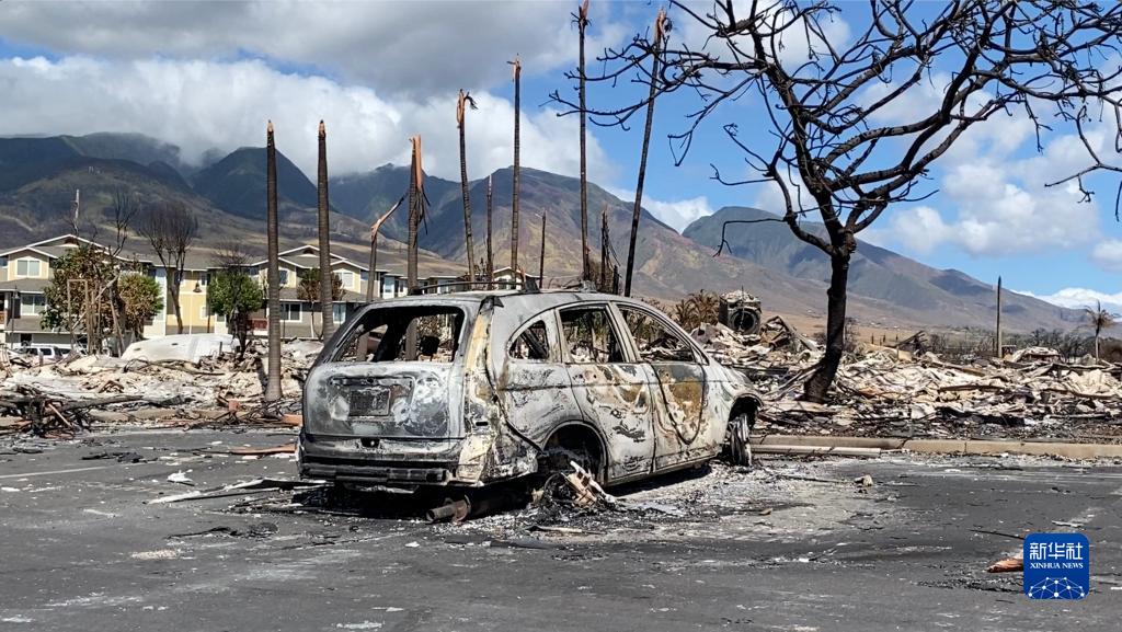 這是8月14日在美國夏威夷州毛伊島拉海納拍攝的野火燒毀的建筑和汽車(chē)殘骸。