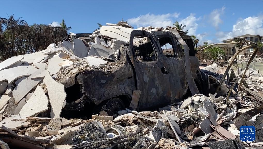 這是8月14日在美國夏威夷州毛伊島拉海納拍攝的野火燒毀的建筑和汽車(chē)殘骸。
