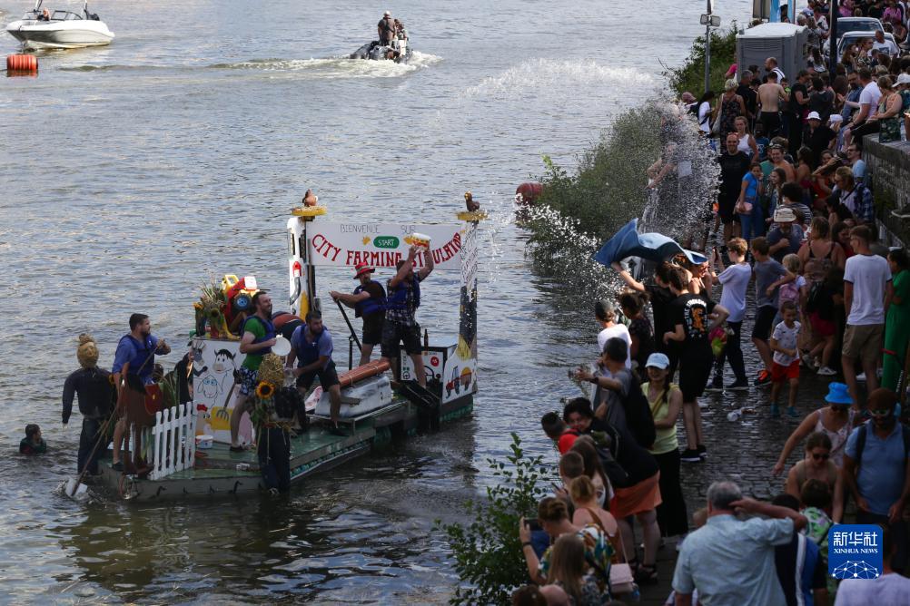 8月15日,在比利時(shí)南部小城迪南的默茲河上,參加者在“浴缸劃船節”上向觀(guān)眾潑水互動(dòng)。
