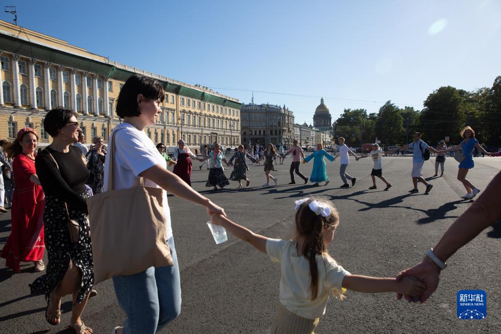 8月15日,民眾在俄羅斯圣彼得堡冬宮廣場(chǎng)跳圓圈舞。