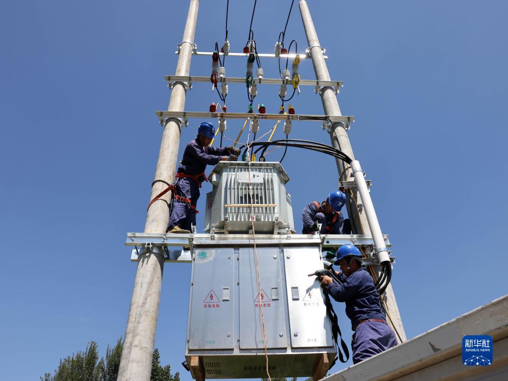 8月16日,電力公司施工人員在河北淶水縣九龍鎮北龍門(mén)村搶修電力設施。