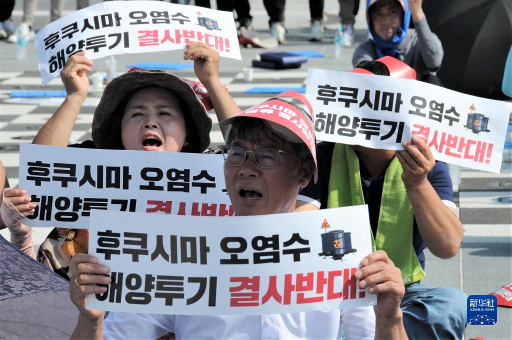 8月16日,在韓國全羅南道高興郡沿海一帶,韓國漁民手持標語(yǔ)參加集會(huì )活動(dòng),抗議日本核污染水排海計劃。