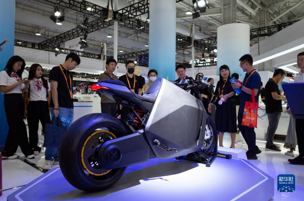 9月5日,觀(guān)眾在服貿會(huì )首鋼園區的中關(guān)村科技園房山園展臺參觀(guān)一款電動(dòng)摩托車(chē)。