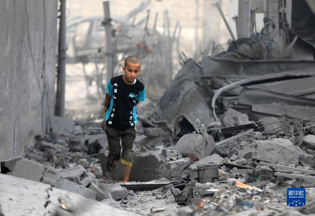 10月25日,在加沙地帶南部城市汗尤尼斯,一名男孩穿過(guò)一片建筑廢墟。