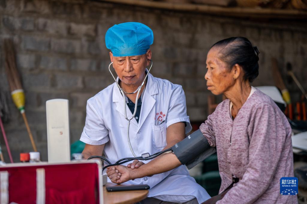 在瑞麗市畹町鎮混板村委會(huì )弄片村民小組,沈坤在家訪(fǎng)時(shí)為村民測量血壓(10月28日攝)。
