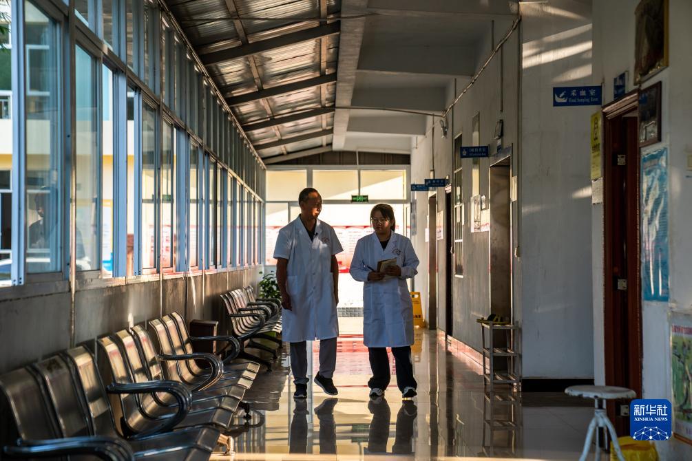 在畹町仁慈醫院,沈坤(左)和一名醫務(wù)人員交流病人病情(11月7日攝)。