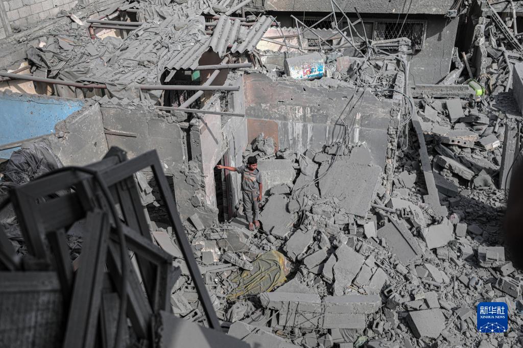 這是11月13日在加沙地帶中部地區拍攝的一個(gè)遭以色列空襲的建筑廢墟。