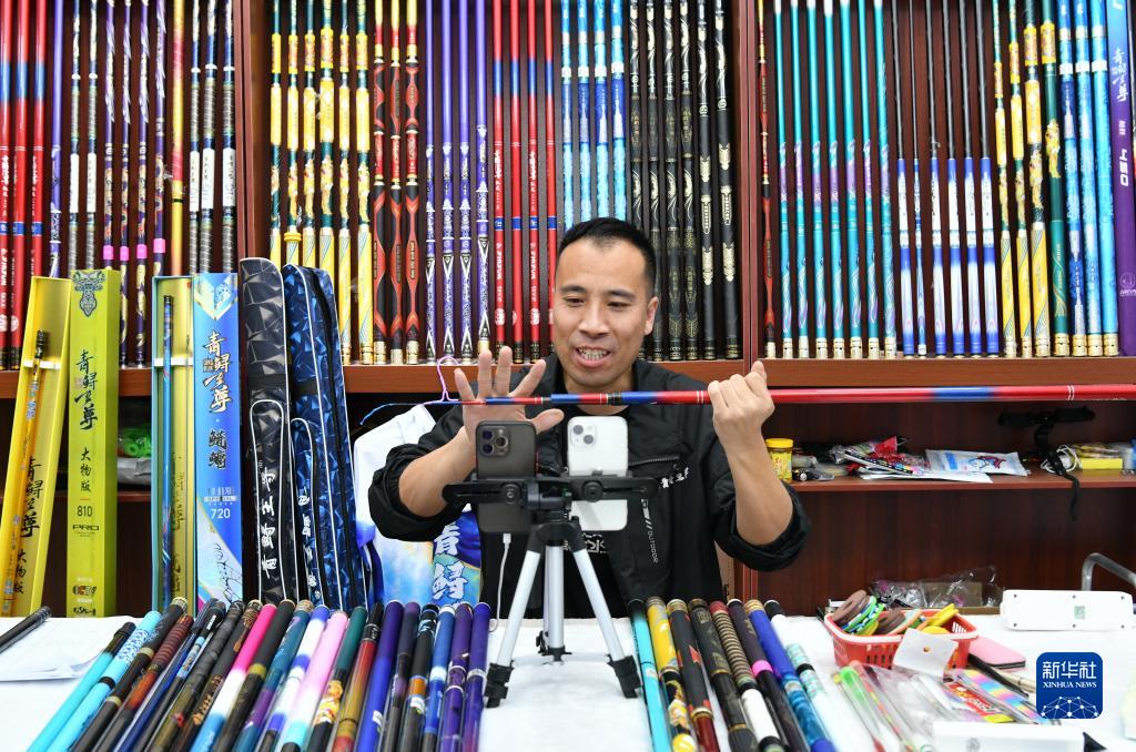 11月14日,在河北省肅寧縣一家魚(yú)竿漁具生產(chǎn)企業(yè)直播間,主播利用直播平臺推介產(chǎn)品。