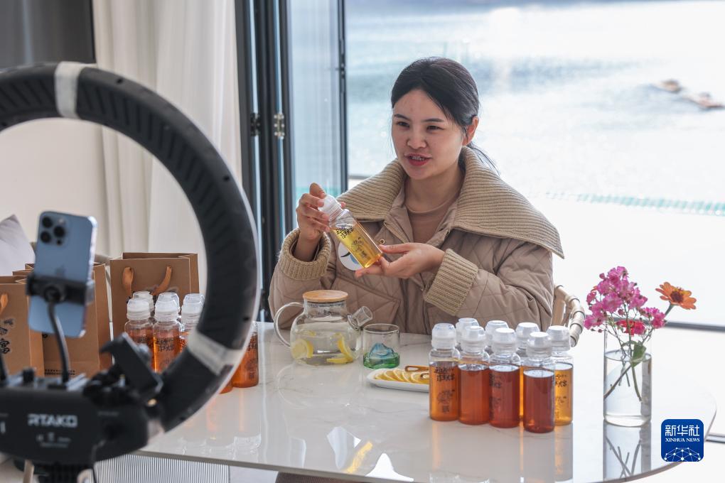 11月14日,在淳安縣宋村鄉一家民宿內,愛(ài)心人士正在為“淳蜜共富”活動(dòng)進(jìn)行網(wǎng)絡(luò )直播,銷(xiāo)售蜂蜜。
