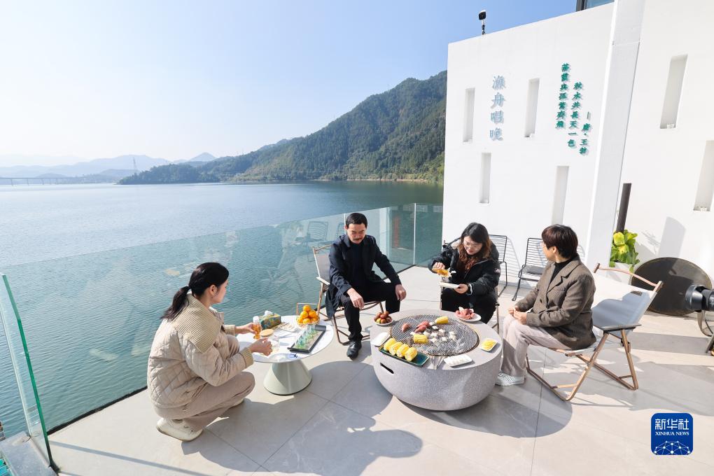 11月14日,在淳安縣宋村鄉一家民宿外,游客在品嘗蜂蜜?!按久酃哺弧被顒?dòng)把特色蜂蜜產(chǎn)品作為特色農產(chǎn)品放在多個(gè)民宿進(jìn)行推介。