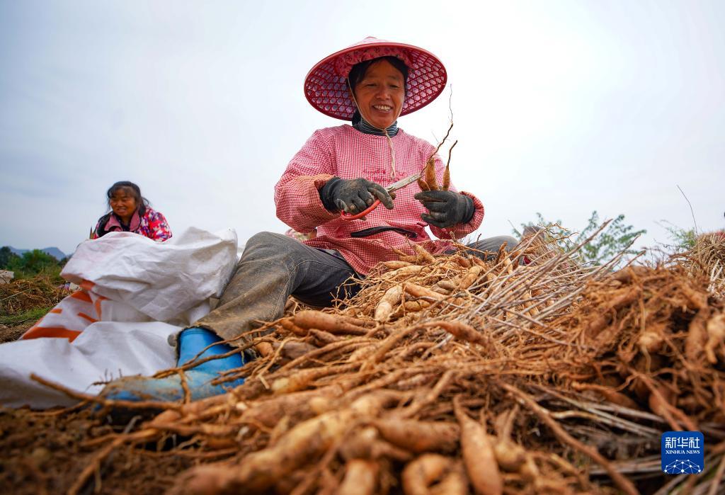11月14日,貴州省黔東南苗族侗族自治州丹寨縣興仁鎮中營(yíng)村村民在收獲中藥材天冬。