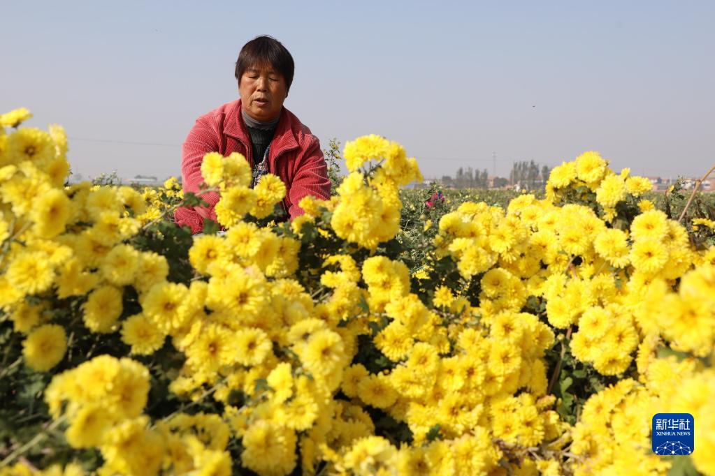 11月14日,河南省焦作市溫縣黃河街道下石井村農民在采收懷菊花。