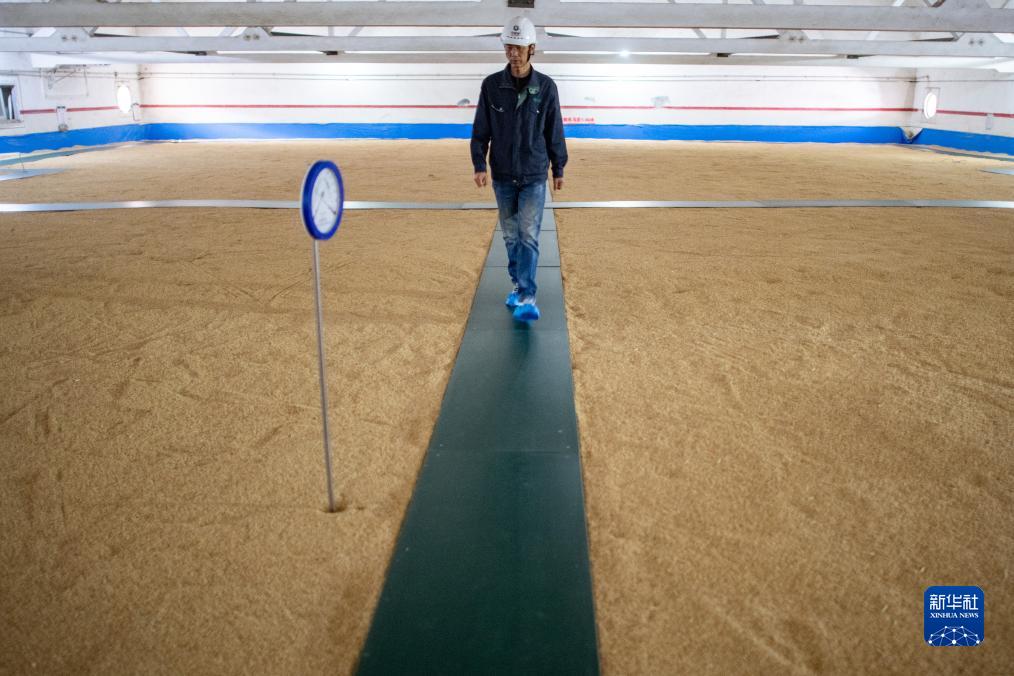 11月14日,在中儲糧仙桃直屬庫有限公司,工作人員在倉房?jì)妊惨暀z查。