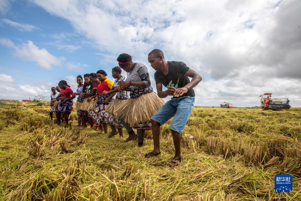 在莫桑比克萬(wàn)寶莫桑農業(yè)園,農戶(hù)在水稻收割現場(chǎng)載歌載舞慶祝豐收(2019年4月7日攝)。萬(wàn)寶莫桑農業(yè)園是中國在非洲最大規模水稻種植項目,極大地緩解了莫桑比克糧食短缺問(wèn)題。