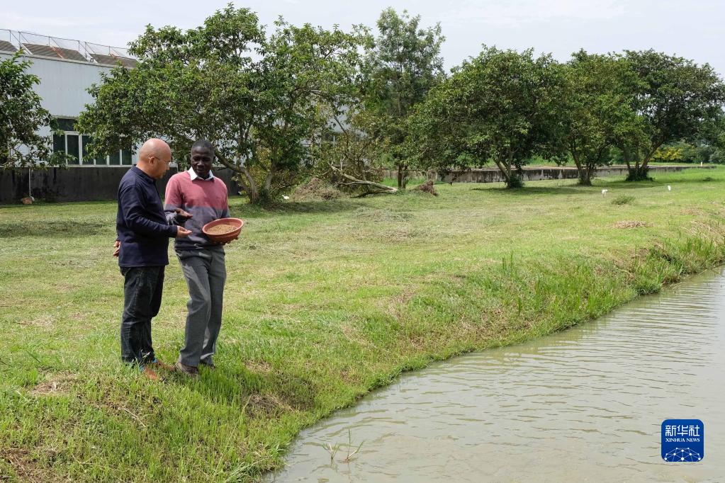 在烏干達首都坎帕拉市郊的烏干達水產(chǎn)研究與發(fā)展中心,一名當地員工在池塘邊與來(lái)自中國的水產(chǎn)專(zhuān)家陳太華交流(2022年12月21日攝)。烏干達水產(chǎn)研究與發(fā)展中心是中國-聯(lián)合國糧農組織-烏干達(三期)南南合作項目水產(chǎn)示范基地,這里的漁場(chǎng)排灌系統采用中國技術(shù)建設而成。
