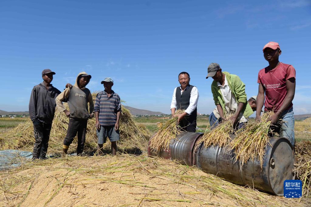 在馬達加斯加首都塔那那利佛附近的馬義奇鎮,中國雜交水稻技術(shù)專(zhuān)家胡月舫(右三)在中國國家雜交水稻工程技術(shù)研究中心非洲分中心的試驗田里和當地農民一起收獲水稻(2023年5月12日攝)。自2007年開(kāi)始,馬達加斯加與中國展開(kāi)雜交水稻技術(shù)合作。馬達加斯加距離實(shí)現糧食自給自足的目標邁近了一大步。