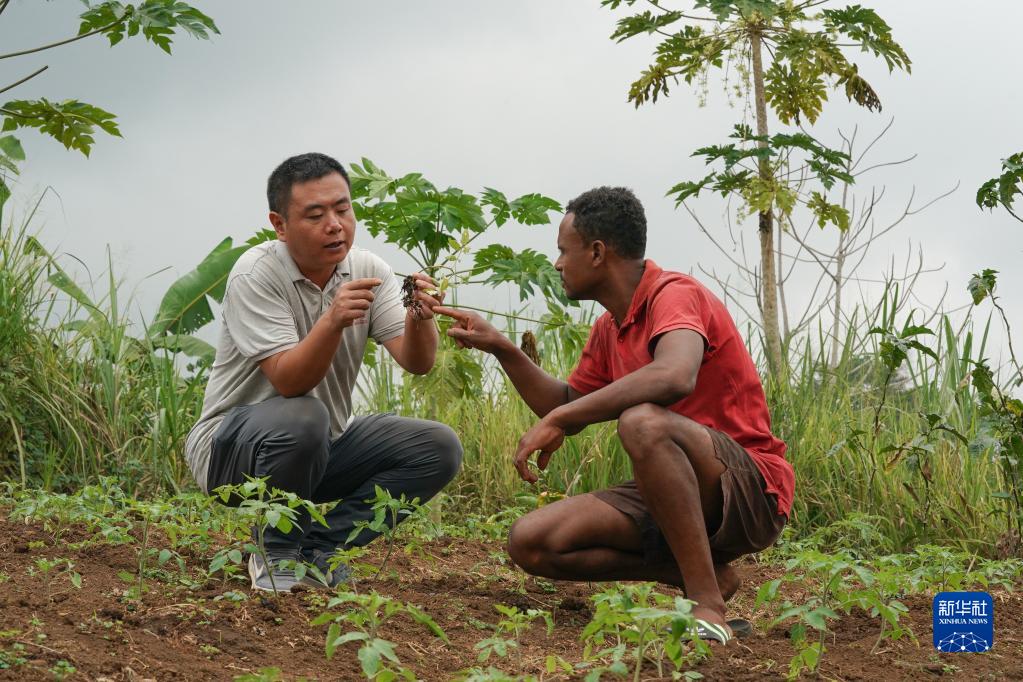 在圣多美和普林西比洛巴塔縣卡德拉斯村,中國援圣普農牧業(yè)技術(shù)專(zhuān)家組專(zhuān)家許州達在田間指導農戶(hù)努內斯種植辣椒(2023年7月15日攝)。中國援圣普農牧業(yè)技術(shù)專(zhuān)家組與圣普農業(yè)、漁業(yè)和農村發(fā)展部合作,于2021年在圣普洛巴塔縣卡德拉斯村建立第一個(gè)中圣普農業(yè)減貧示范村,并有效結合中國農業(yè)技術(shù)和扶貧經(jīng)驗幫助當地農民增產(chǎn)增收。