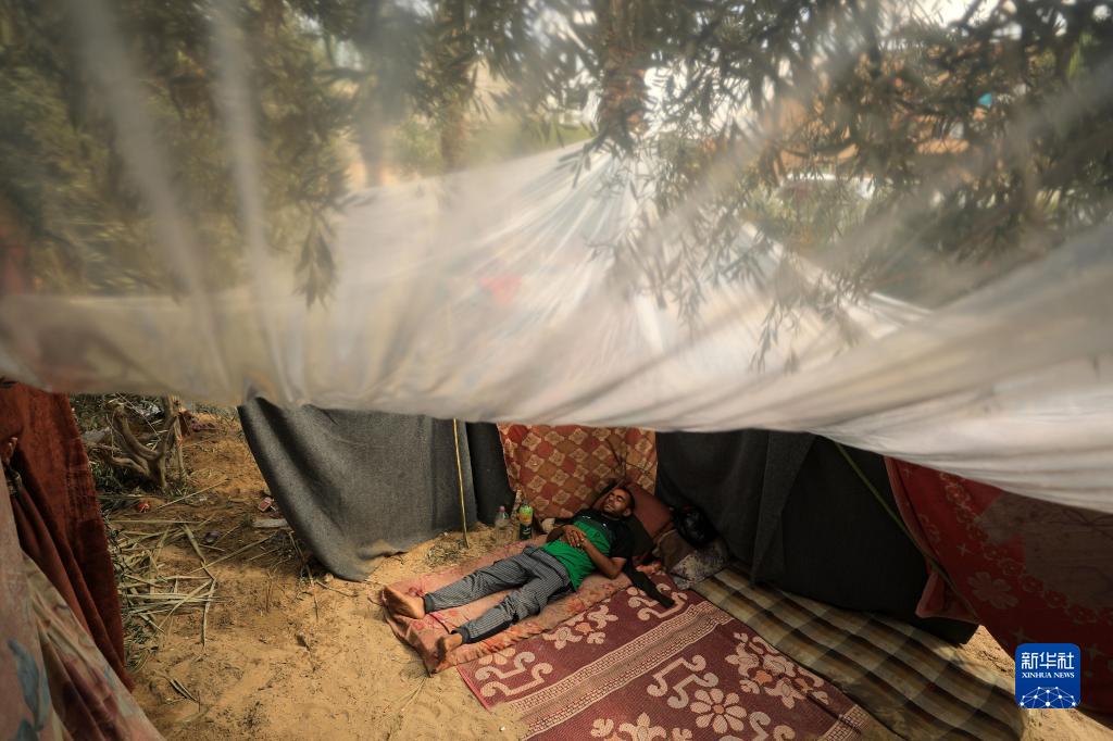 這是11月14日在加沙地帶南部城市汗尤尼斯一個(gè)臨時(shí)營(yíng)地拍攝的流離失所的巴勒斯坦人。