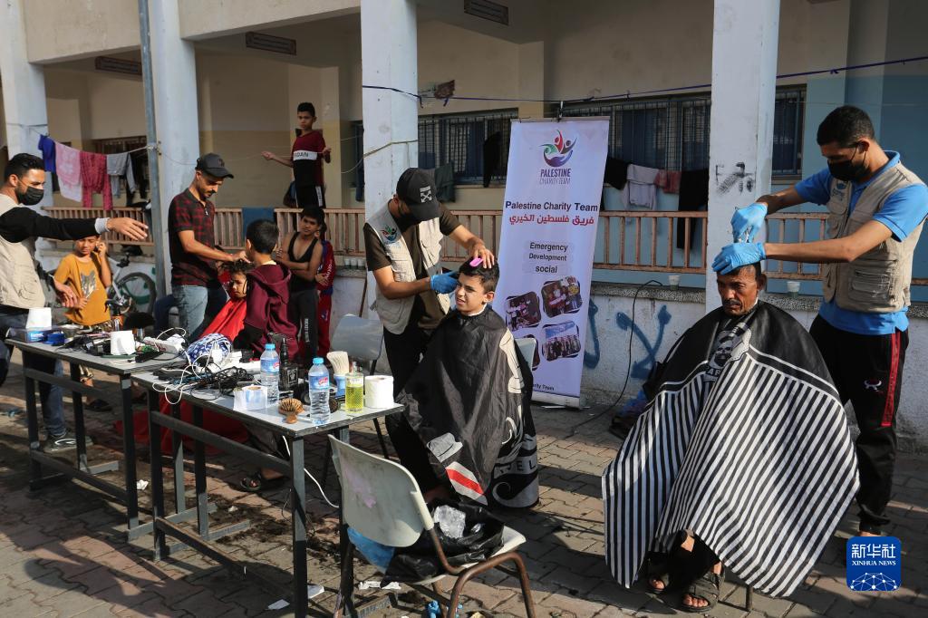 11月14日,在加沙地帶南部城市拉法,志愿者為流離失所的巴勒斯坦人理發(fā)。