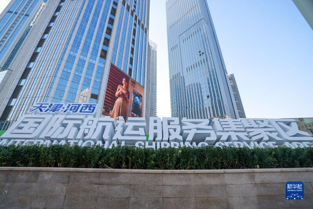 這是在天津小白樓中央商務(wù)區一棟商務(wù)樓宇下拍攝的航運服務(wù)集聚區標志牌(11月14日攝)。