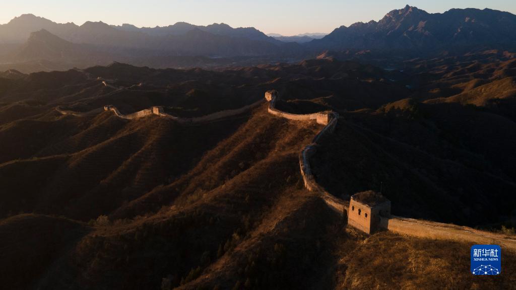 這是11月14日拍攝的夕陽(yáng)下的古北口長(cháng)城蟠龍山段(無(wú)人機照片)。