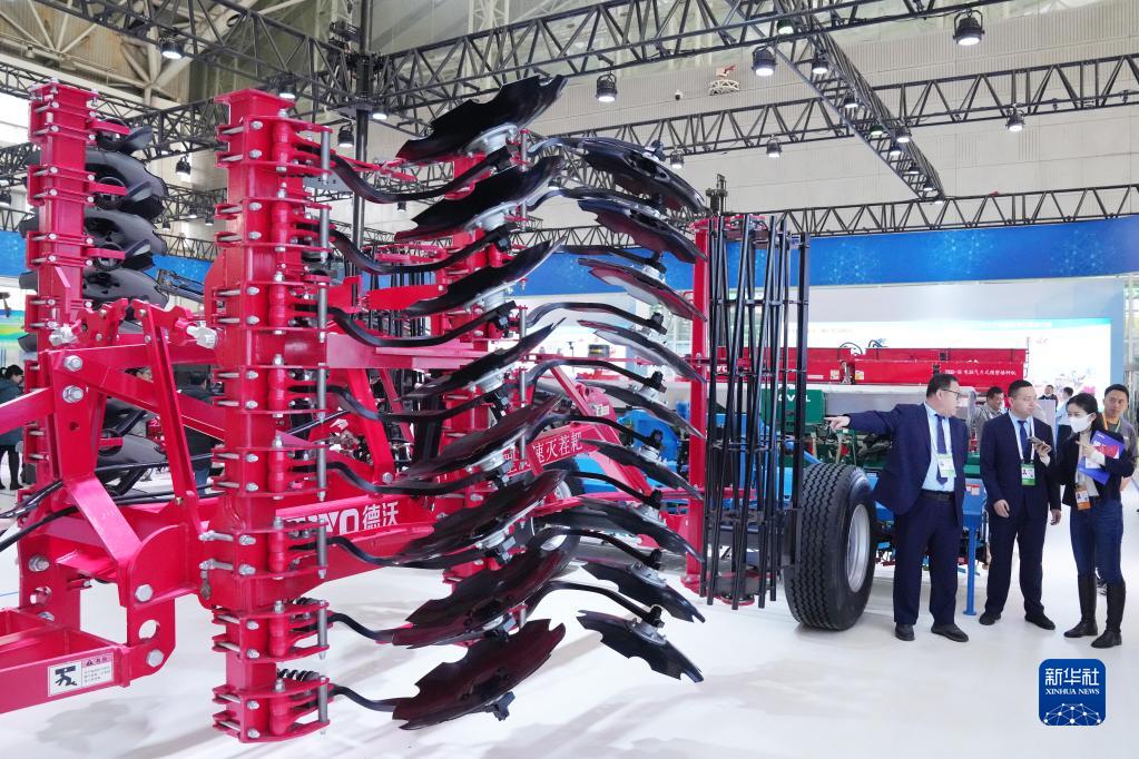 11月15日,在首屆中國(黑龍江)國際綠色食品和全國大豆產(chǎn)業(yè)博覽會(huì )大豆農機裝備展區,參會(huì )者在了解農機情況。