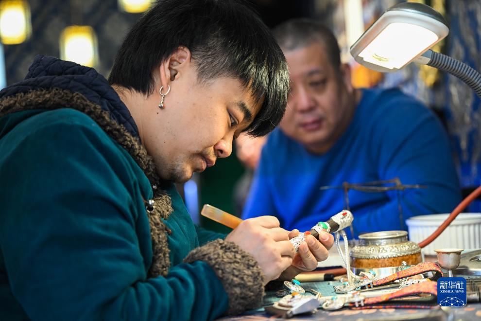 11月14日,在內蒙古烏拉特前旗禾蘇格爾銀匠店內,齊天賜在加工銀器。