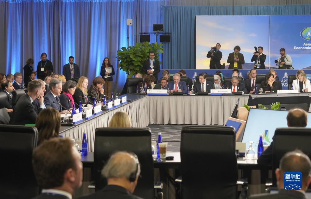 這是11月14日在美國舊金山拍攝的亞太經(jīng)合組織部長(cháng)級會(huì )議現場(chǎng)。