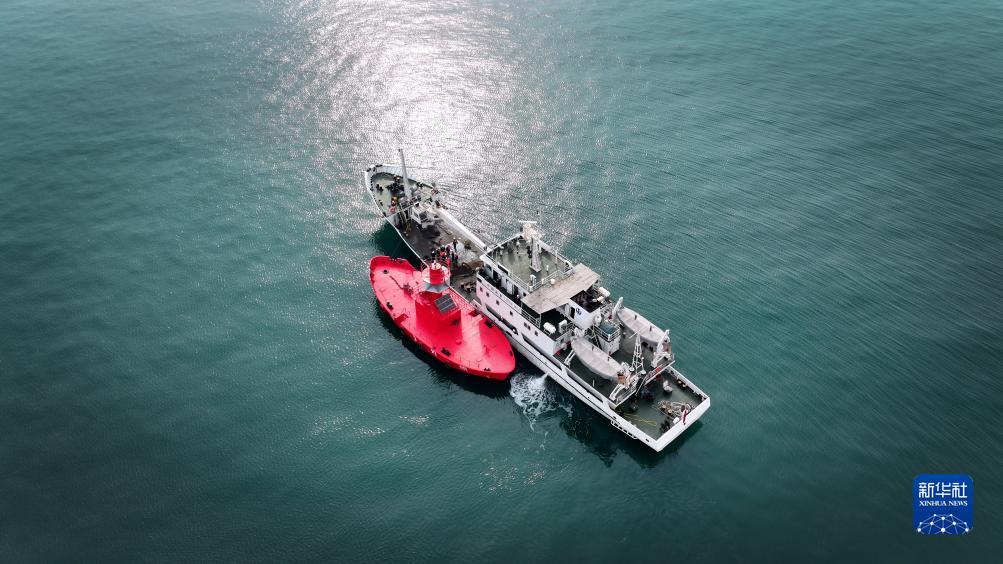 11月15日,青島航標處一艘工作船在進(jìn)行燈船更換作業(yè)(無(wú)人機照片)。