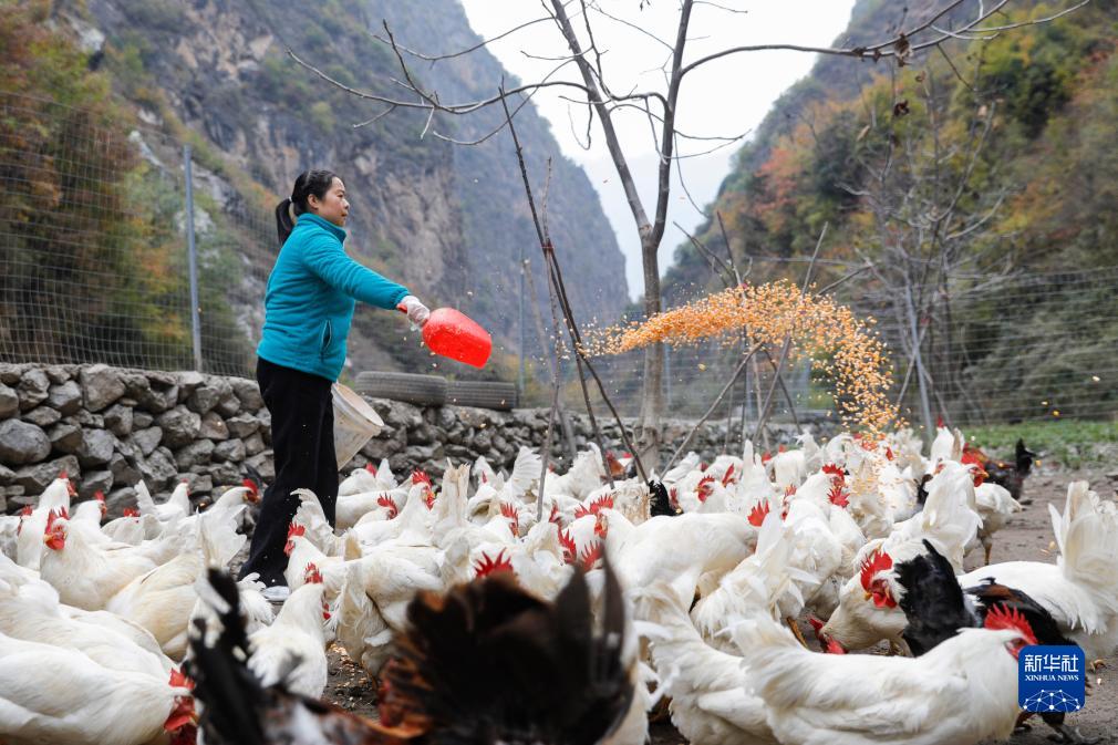 11月15日,在舟曲縣峰迭鎮狼岔壩村,村民在喂土雞。