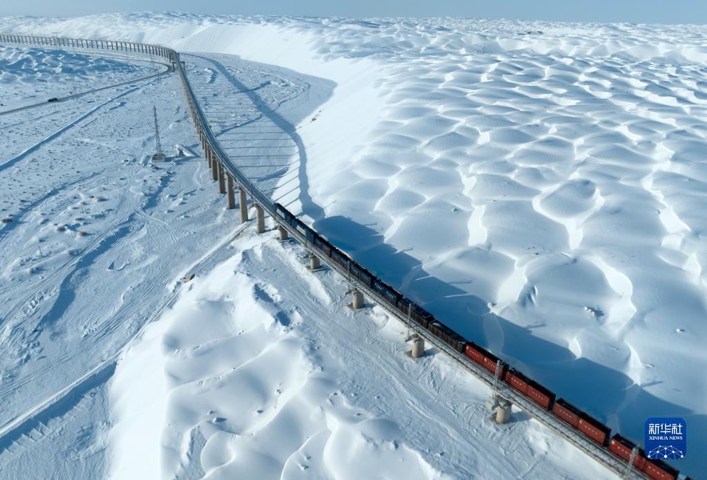 11月15日,在阿克塞縣,一列火車(chē)在大漠中穿行(無(wú)人機照片)。