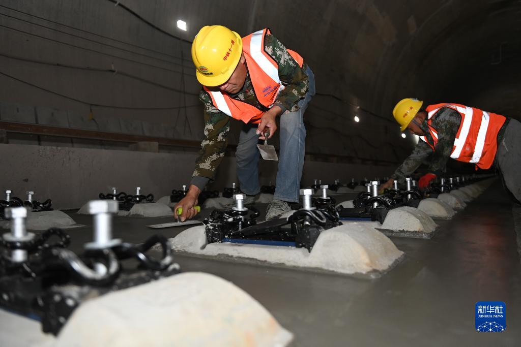 11月16日,中鐵十一局的建設者在杭衢鐵路(建衢段)天池山隧道無(wú)砟軌道澆筑施工現場(chǎng)作業(yè)。