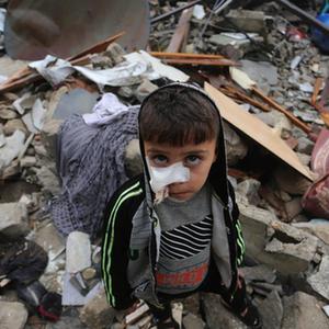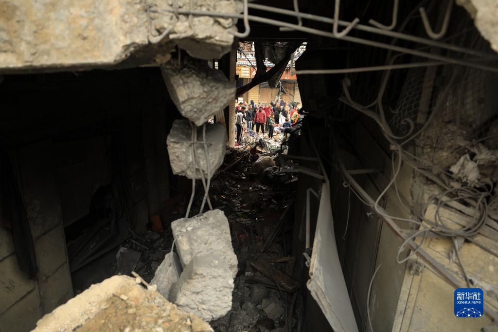 11月15日,在加沙地帶南部城市汗尤尼斯,人們查看遭以色列空襲后的建筑廢墟。