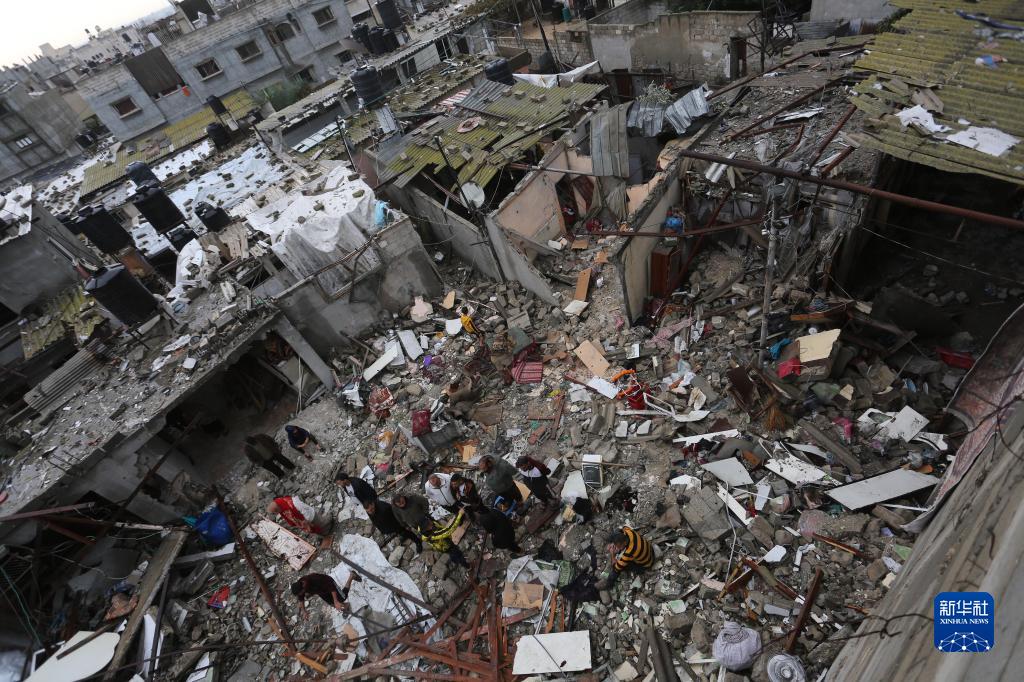 11月15日,在加沙地帶南部城市拉法,人們查看遭以色列空襲后的建筑廢墟。