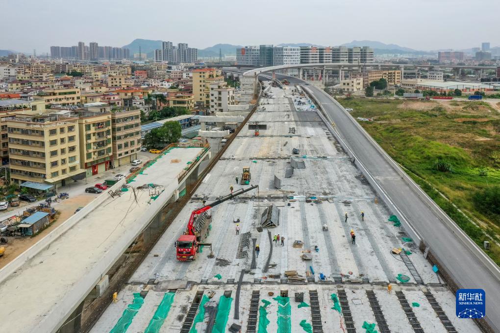11月16日,建設者在中山坦神北路主線(xiàn)進(jìn)行橋面系施工(無(wú)人機照片)。