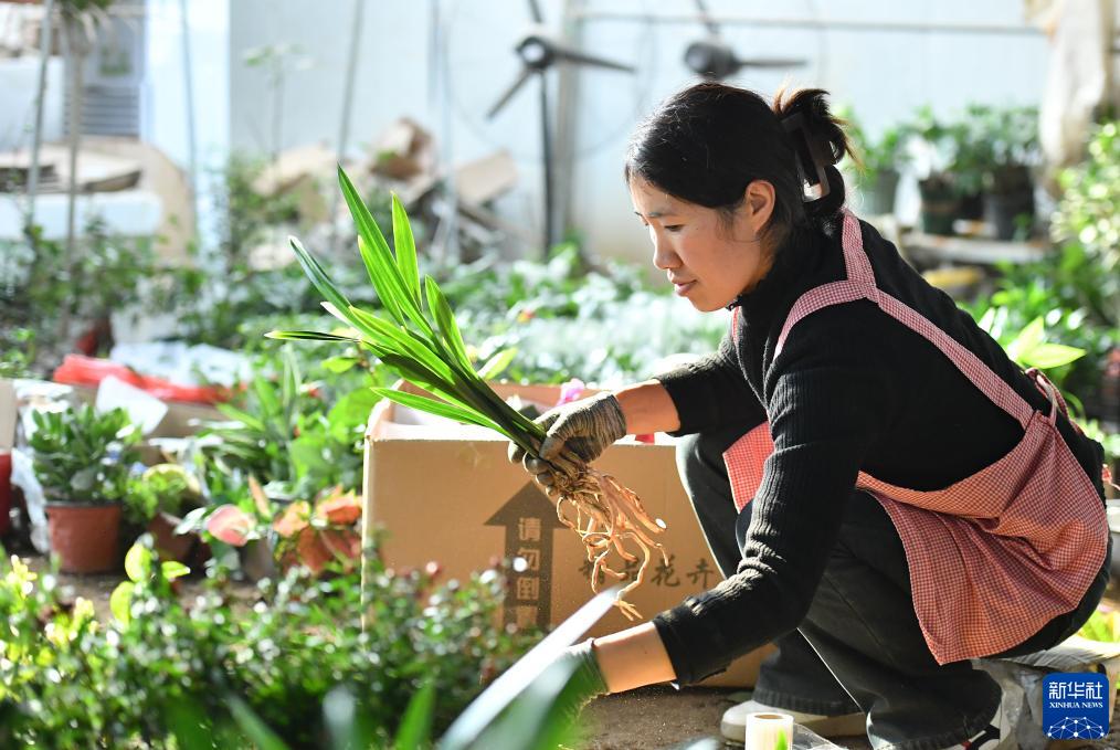 11月16日,在沭陽(yáng)縣顏集鎮堰下村幸?;êk娚讨辈セ?,花農在包裝花卉。